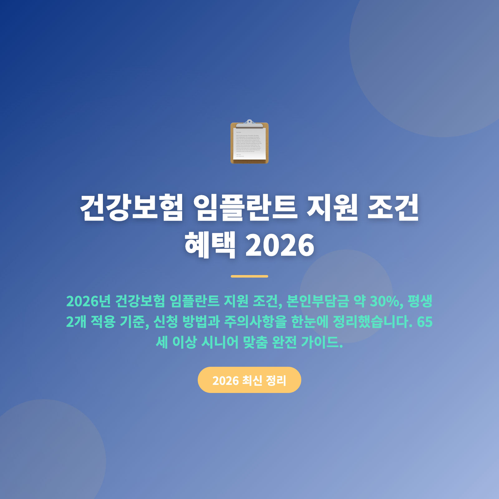 건강보험 임플란트 지원 조건 혜택 2026 총정리: 만 65세 이상 평생 2개·본인부담 30%·신청 방법부터 상급종합병원 연락처까지 완전 가이드