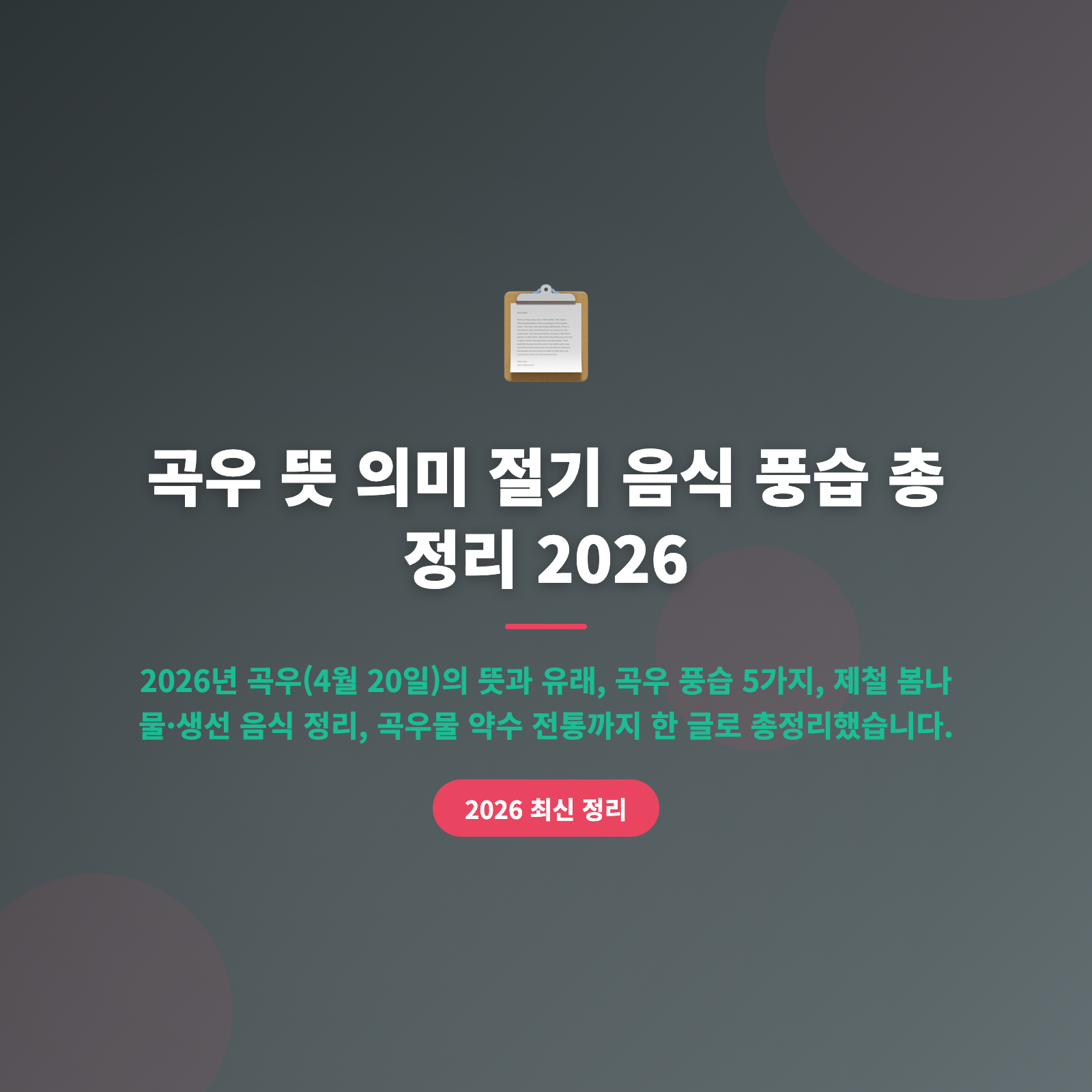 ✅ 2026년 곡우는 4월 20일(월요일), 봄의 마지막 절기입니다 ✅ 곡우 뜻: "봄비가 내려 백곡을 기름지게 한다" — 본격 농사의 시작 ✅ 곡우물(나무 수액) 마시기, 봄나물 채취, 비 점치기 등 다양한 풍습이 전해집니다 ✅ 제철 음식으로 달래·두릅·씀바귀 + 도다리·주꾸미·꽃게를 챙겨 보세요 ✅ 곡우가 지나면 입하(여름 시작)가 오니, 봄의 마지막 정취를 충분히 누려 보시기 바랍니다
