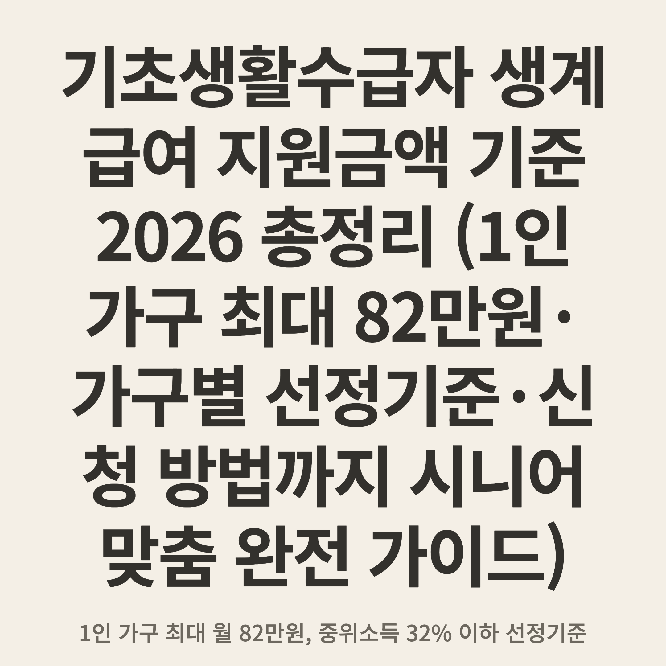 기초생활수급자 생계급여 지원금액 기준 2026 총정리 (1인 가구 최대 82만원·가구별 선정기준·신청 방법까지 시니어 맞춤 완전 가이드)