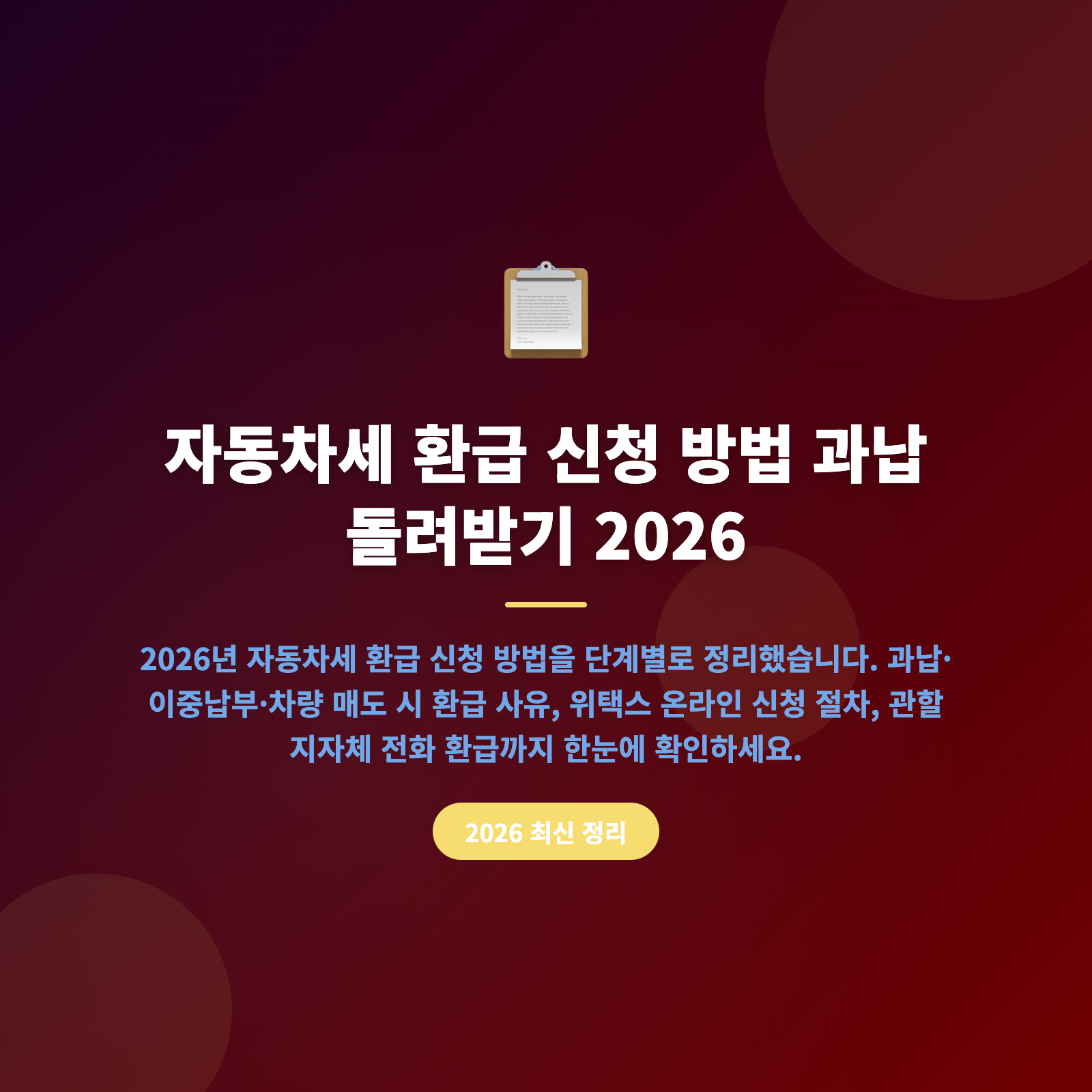 ✅ 위택스(wetax.go.kr)에서 환급금 조회 — 로그인 후 3분이면 확인 가능 ✅ 환급 사유 확인 — 차량 매도·폐차·이중납부·과납 여부 점검 ✅ 사전 계좌등록 완료 — 한 번 등록하면 향후 환급금 자동 입금 ✅ 5년 시효 확인 — 오래된 과납금이 있다면 소멸 전에 반드시 청구 ✅ 스미싱 주의 — 환급 안내 문자 링크는 절대 클릭 금지, 위택스 직접 접속만