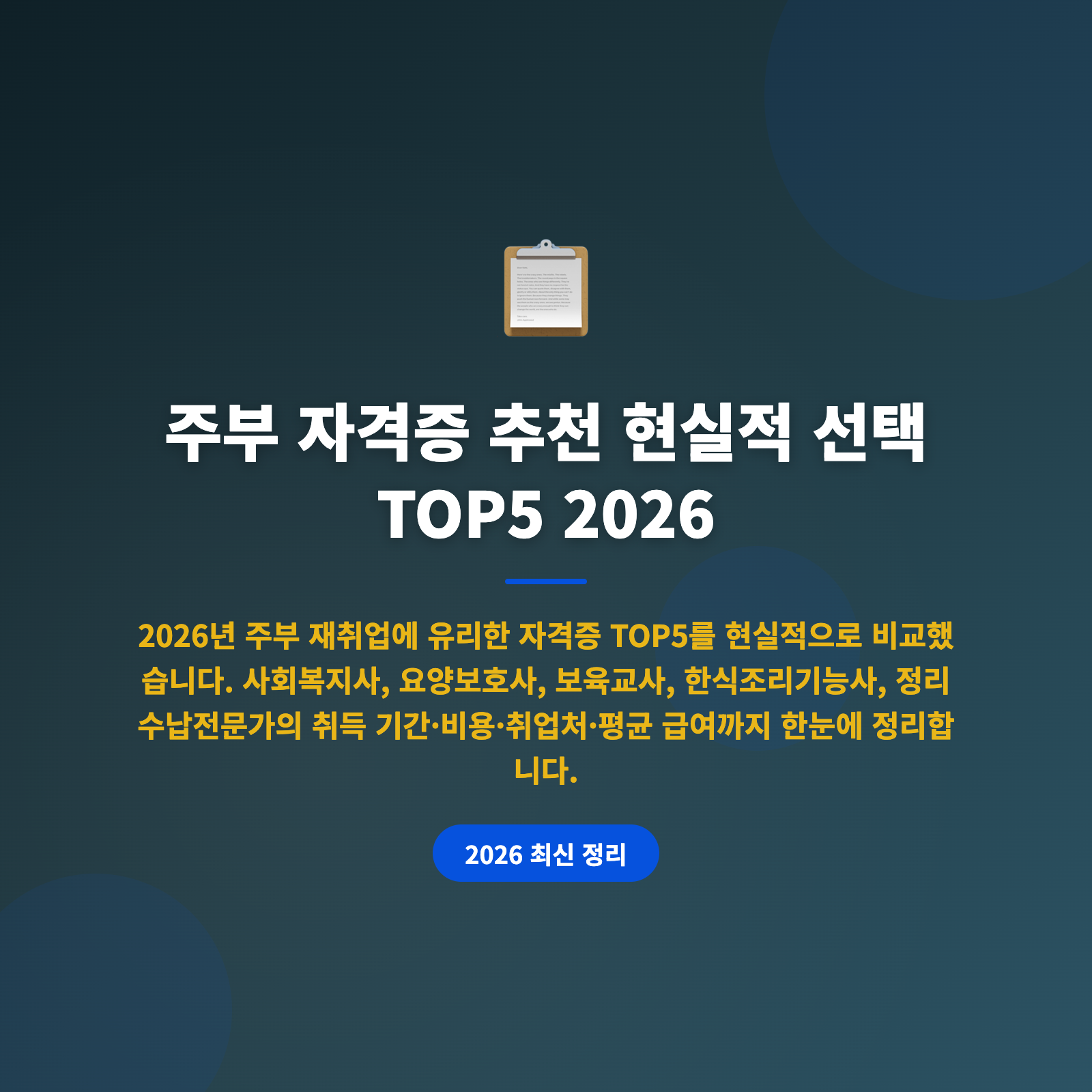 주부 자격증 추천 현실적 선택 TOP5 2026 총정리: 사회복지사·요양보호사·보육교사·한식조리기능사·정리수납전문가 취득 비용부터 취업처까지 완전 가이드