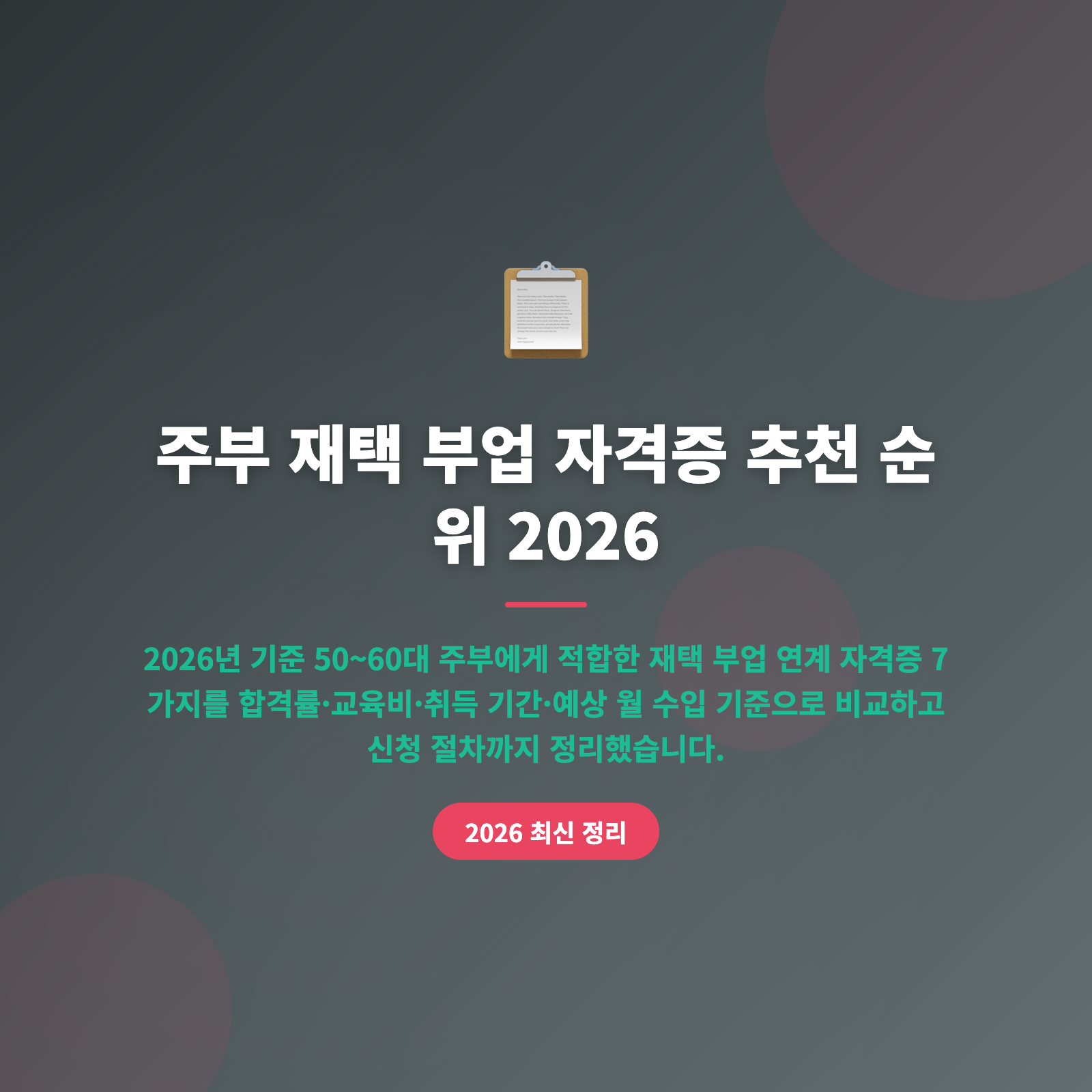 주부 재택 부업 자격증 추천 순위 2026: 50~60대 시니어 맞춤 TOP 7 합격률·교육비·월 수입 전망 완전 정리