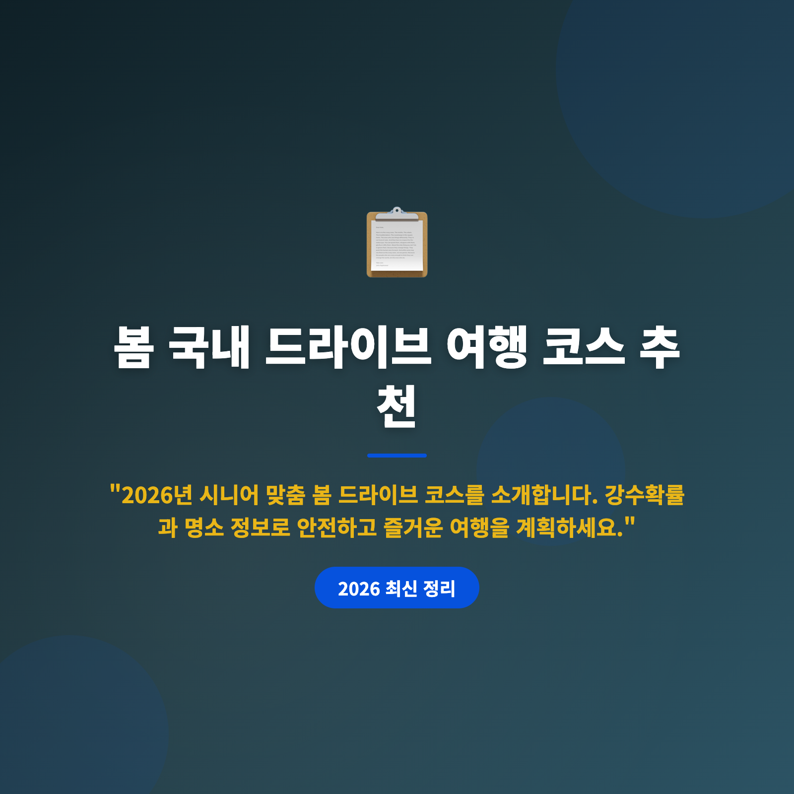 많은 분들이 봄의 시작과 함께 가족 또는 친구들과 함께하는 드라이브 여행을 기대하고 있습니다. 그러나 매년 어디로 가야 할지 결정하는데 어려움을 겪고 계실 텐데요. 이번 글에서는 2026년을 맞아 시니어 여러분께 추천드리는 국내 드라이브 여행 코스 TOP 5를 소개해 드리겠습니다. 각 지역별 주간 날씨 예보와 추천 명소, 각종 편의시설 정보까지 알차게 준비했습니다.