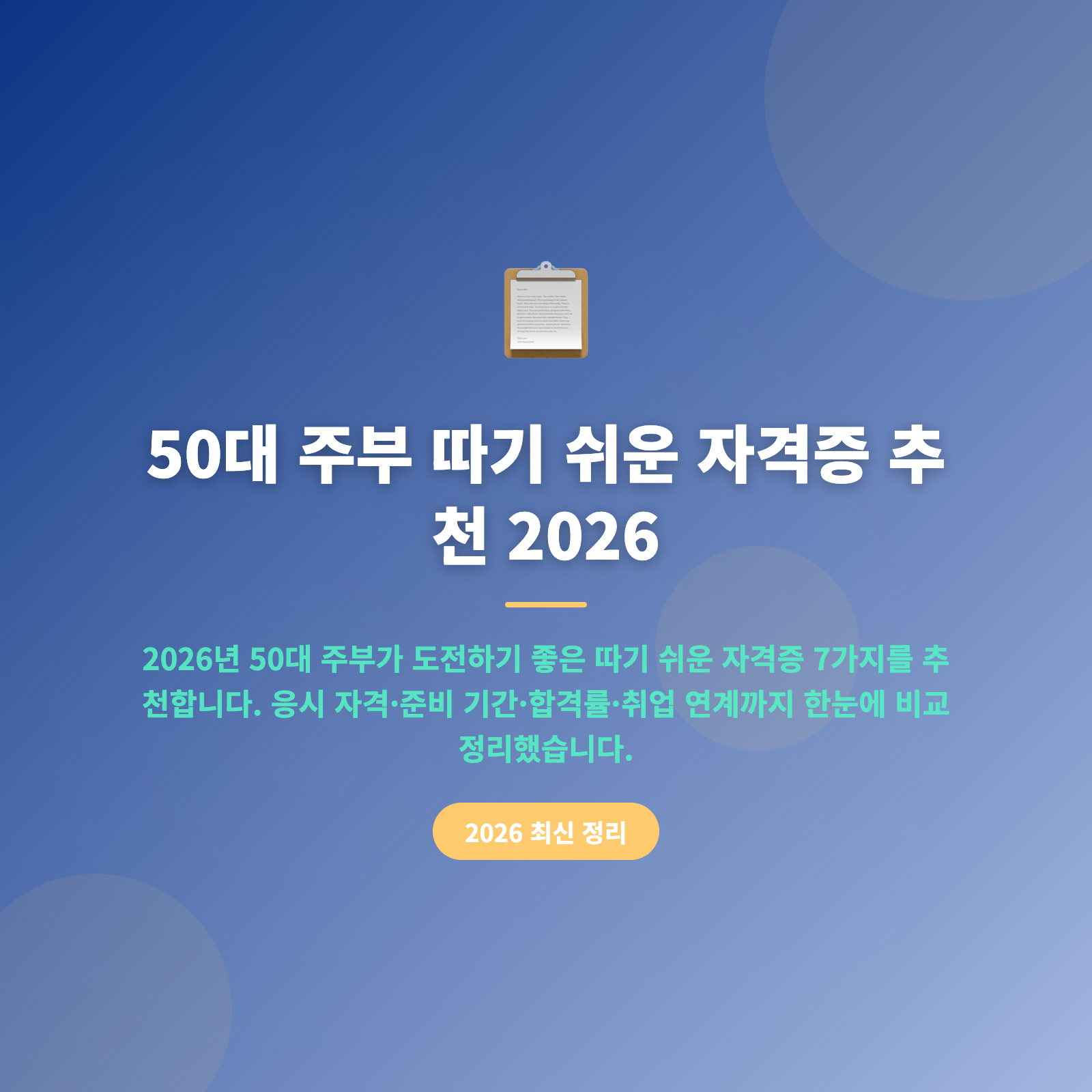 위 자격증들은 모두 50대 여성 응시자가 특히 많은 종목이며, 주부 자격증 추천 재취업 유망 분야 2026 총정리에서 간호조무사·사회복지사 등 더 많은 자격증 정보를 확인할 수 있습니다.