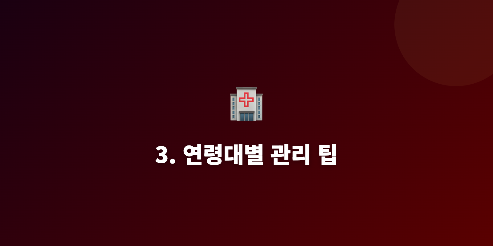 - 50대: 활발한 신체 활동이 중요합니다. 규칙적인 건강검진을 통해 건강 상태를 확인하세요. - 60대: 꾸준한 건강 관리가 필수입니다. 약물 복용에 대한 전문가의 지도를 받는 것이 중요합니다.